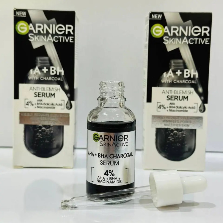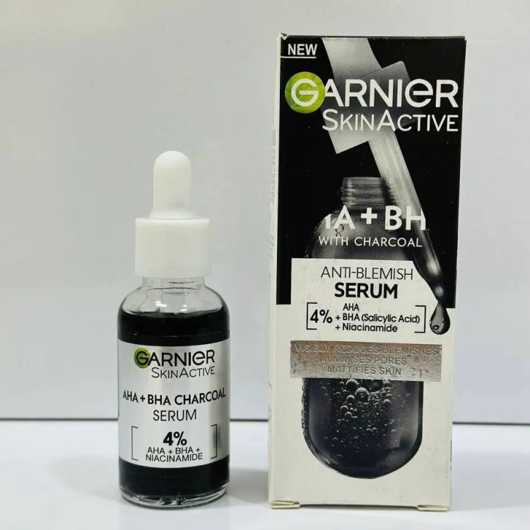 سرم زغالی ضد عیوب پوست گارنیر حاوی نیاسینامید 30 میل حاوی سالیسیلیک اسید، زغال، نیاسینامید، AHA و BHA. لایه برداری پوست یکدست کننده رنگ پوست قابلیت جذب سریع پوست کاهش جوشهای سرسیاه کاهش منافذ باز پوست کاهش 35 درصد عیوب پوست صورت افزایش شفافیت و درخشندگی پوست