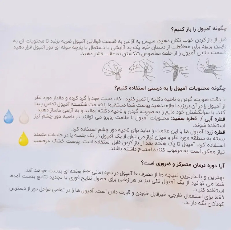 محصول کشور آلمان پک 5 عددی حجم هر سرم 2 میلی لیتر کاهش پف دور چشم ها مناسب آقایان و بانوان مناسب انواع پوست کاهش تیرگی دور چشم ها افزایش گردش خون در مویرگ ها ترمیم کننده پوست دور چشم جوان-ساز فوق العاده اطراف چشم ضدچین وچروک نحوه استفاده از سرم قبل از هر چیز ناحیه مد نظر پوست خود را کاملا تمیز نمایید ، سپس 3 تا 5 قطره از سرم را روی کف دست خود بریزید. سرم را روی ناحیه مد نظر پوست خود بمالید و به آرامی ماساژ داده تا کامل جذب پوستتان شود .