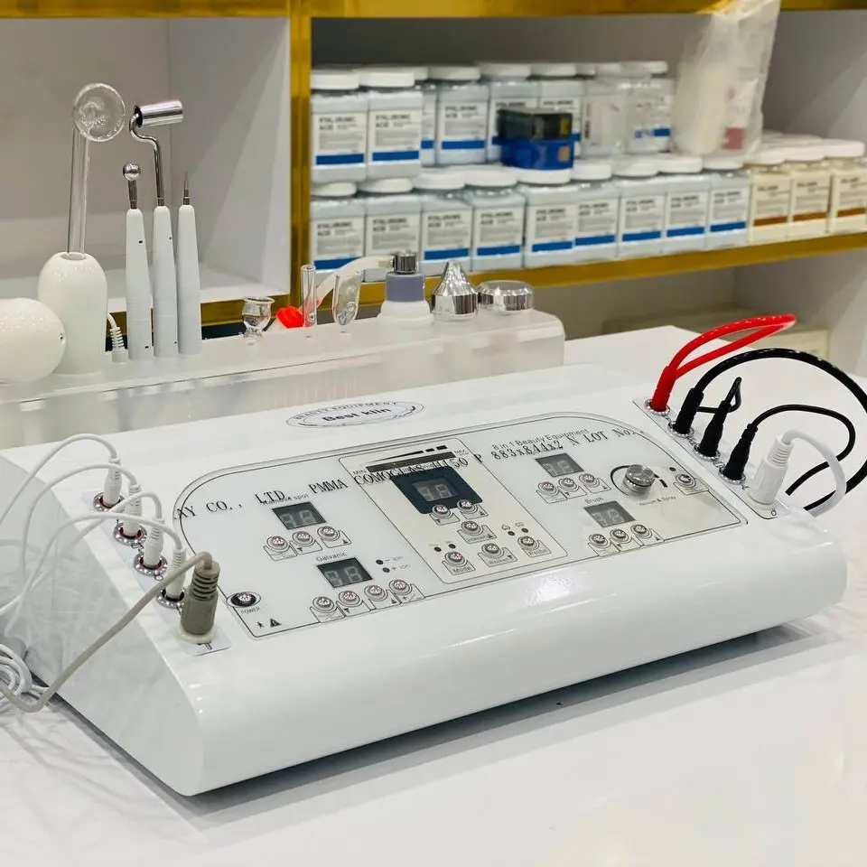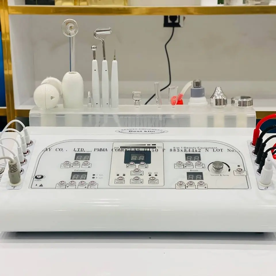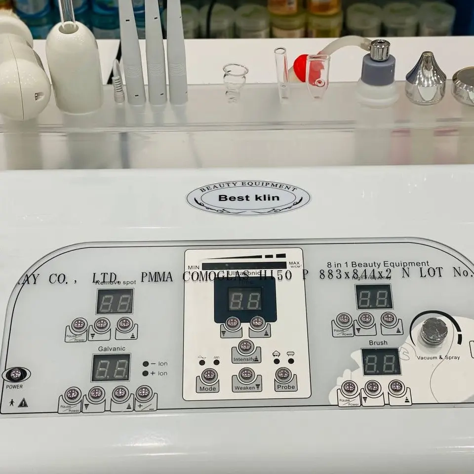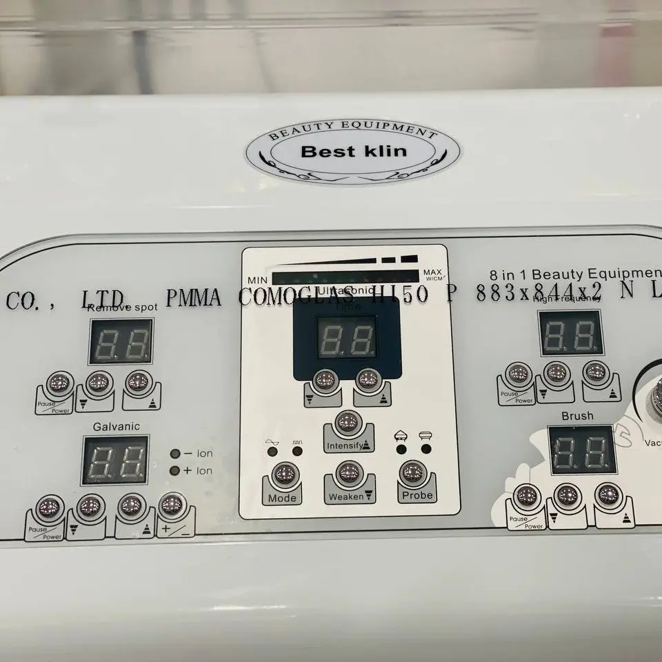 • التراسوند دور چشم • التراسوند صورت • گالوانیک • اسپری • هایفرکانسی • فیس براش • میکرودرم ۳ سر • پلاسما ضد پیری، مرطوب کننده پوست، سفت کردن پوست شکل دادن به پوست ، کوچک شدن منافذ ، بهبود چانه تمیز کردن عمیق پوست، درمان آکنه سفید کردن پوست، بهبود پوست مات مایل به زرد، بهبود بافت پوست رفع چین و چروک و درمان آکنه و حساسیت های پوستی تقویت و آبرسانی و ایجاد آرامش مزو تراپی جهت جوانسازی پوست - هیدروکربن یا همان میکرودرم : روشی جدید برای درمان پوست می باشد که به جای لیزر از آن استفاده می شود. دستگاه آکوافیشیال ۸ کاره کلین به طور همزمان عمل پاکسازی ، لایه برداری ، استخراج ، هیدراتاسیون را انجام داده و از خاصیت آنتی اکسیدانی پوست محافظت می کند بدون ایجاد درد و ناراحتی پوست را زیبا و جذاب می نماید روشی کاملا درمانی و تسکین دهنده ، مرطوب کننده ، غیر نهاجمی و غیر حساس است. ۲- دسته BIO : کارکرد آن سینوسی بوده و باعث تقویت ،آرامش و تسکین پوست می شود همچنین با استفاده از فرآیند متابولیسم سبب کاهش تورم می گردد. ۳- دسته اتو صورت ( التراسونیک) : از دسته التراسونیک برای جذب بهتر و سریعتر مواد درمانی برای پوست استفاده می گردد برای مثال وقتی که شما می خواهید مواد آبرسان و تغذیه کننده پوست یا هر داروی دیگر مخصوص پوست را استعمال کنید اگر از دسته اتو صورت دستگاه آکوافیشیال هشت کاره کلین استفاده نمایید التراسونیک دارو را تا بیست برابر سریعتر و بهتر جذب پوست کرده و پوست شما را دو چندان زیبا و در خشان تر می نماید. ۴- دسته RF : دستگاه آکوافیشیال ۸ کاره کلین دارای بازوی آر اف می باشد. آر اف زیر پوست گرما ایجاد کرده و در زیر بافت های پوستی از حرکت الکترونیکی با قطب های مثبت و منفی استفاده می کند در نتیجه گرمایش ملوکولی تولید می گردد همچنین در پاسخ به این عمل در عمق پوست نیز گرما ایجاد می کند از این رو باعث تحریک ، انقباض و تولید سریع کلاژن می شود. شکاف های آتروفی با ترشح کلاژن پر شده که پوست صورت را با از بین بردن کامل چین و چروک کاملا بازسازی می نماید در نتیجه آن پوست سفت ، شاداب ، درخشان و جوان می گردد. کارکرد آن سینوسی بوده و باعث تقویت ،آرامش و تسکین پوست می شود همچنین با استفاده از فرآیند متابولیسم سبب کاهش تورم می گردد. ۵- دسته آیس رولر : دستگاه آکوافیشیال هشت کاره کلین دارای آیس رولر می باشد. آیس رولر همانطور که از نامش پیداست یعنی غلتک یخی که سرما ایجاد می کند و سرمای تولید شده توسط آن منافذ باز پوست را کاهش داده و آرامش خاصی را در سطح پوست به وجود می آورد همچنین چین و چروک را حذف کرده و التهابات پوستی ناشی از جوش را بهبود می بخشد. ۶- دسته اسپری اکسیژن : دسته اکسیژن متابولیسم سلول های پوستی را سرعت بخشید ه و پوست را صاف و تمیز می نماید که برای این منظور از نیروی جاذبه اکسیژن خالص تولیده شده استفاده می کند چون توانایی تخلیه نود و هشت درصدی اکسیژن را داشته و مواد غذایی را به طور کامل به داخل پوست تقطیر می نماید. ۷- دسته نور درمانی (ماسک ال ای دی) : آکوافیشیال هشت کاره کلین دارای ماسک نقابی می باشد. این ماسک دارای چند طیف رنگ می باشد که قابلیت تغییر شدت نور را دارد طول موج های متفاوت ماسک ال ای دی برای رفع لک ، چین چروک ، تقویت عضلات و جوانسازی پوست به کار می رود هچنین تیرگی های ایجاد شده ناشی از آفتاب سوختگی و حامله بودن را نیز از بین می برد. ۸- دسته مزوگان : این افزونه با تزریق مواد مغذی و ویتامین های لازم در زیر پوست می تواند زیبایی ماندگار را برای پوست به همراه آورد استفاده از این قسمت بسیار حساس می باشد چون این عملیات باید کاملا بهداشتی و در کامل دقت انجام شود.