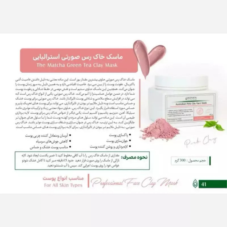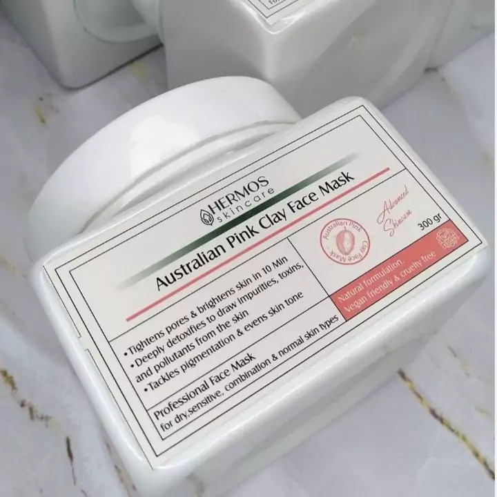 • پاکسازی پوست جوان سازی پوست • لایه برداری و روشن کننده پوست • آبرسان و متعادل کننده چربی پوست • کاهش جوشهای سرسیاه • مناسب پوست خشک و حساس در واقع ماسک خاک رس صورتی استرالیایی هرموس موجب از بین بردن بسیاری از عیوب پوستی می گردد و برطرف کننده چین و چروک پوستی هم میباشد به عنوان شفاف کننده پوست صورت و همچنین پاک کننده عمیق منافذ باز پوست میتوان از این نمونه ماسک استفاده نمود نحوه استفاده از ماسک : مقداری از ماسک خاک رس را با آب کافی مخلوط کنید تا خمیر یکدست ایجاد شود. لایه نازکی از ماسک را روی صورت قرار دهید حدود 15 دقیقه صبر کنید تا کامل خشک شود و خواص خود را روی پوست اجرایی کند سپس با آب شستشو دهید.
