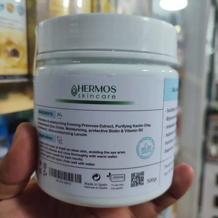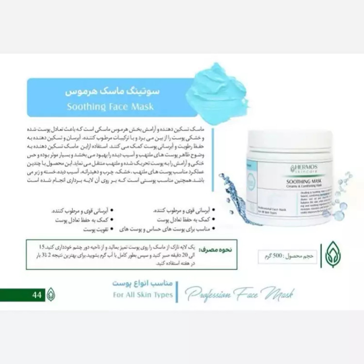 • حجم محصول : 500 گرم • آبرسانی قوی و مرطوب کننده • کمک به حفظ تعادل پوست • آبرسانی قوی و مرطوب کننده • کمک به حفظ تعادل پوست • مناسب برای پوستهای حساس • تقویت پوست ✔️ مواد تشکیل دهنده • هیالورونیک اسید و آلژین : محافظت از پوست • آلانتویین و هیدراکتین آر: مرطوب کننده • عصارههای مختلف گیاهی : آرامش دهنده پوست • عصاره ریشه شیرین بیان:تغذیه کننده قوی • ویتامین B3 نیاسین آمید:متعادل کننده پوست • ويتامين B5:پانتنول رطوبت رسان های قوی • اکسید روی: جذب کننده چربیهای اضافه پوستو تسکین دهنده • ویتامین E و عصاره لیمو: آنتی اکسیدان های قوی و جوانساز • عصاره برگ زیتون: تسکین دهنده قوی • عصاره جلبک :قرمز مغذی پوست روش استفاده از سوتینگ ماسک هرموس یک لایه نازک از ماسک را روی پوست تمیز بمالید و از ناحیه دور چشم خودداری کنید. 15 الى 20 دقیقه صبر کنید و سپس بطور کامل با آب گرم بشویید. برای بهترین نتیجه 2 تا 3 بار در هفته استفاده کنید.
